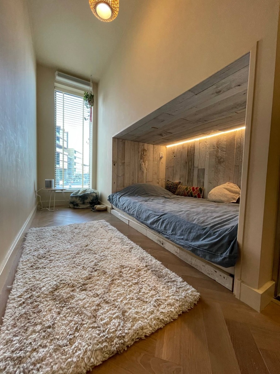 1. DIY-bedstee met opbergruimte en wandplanken