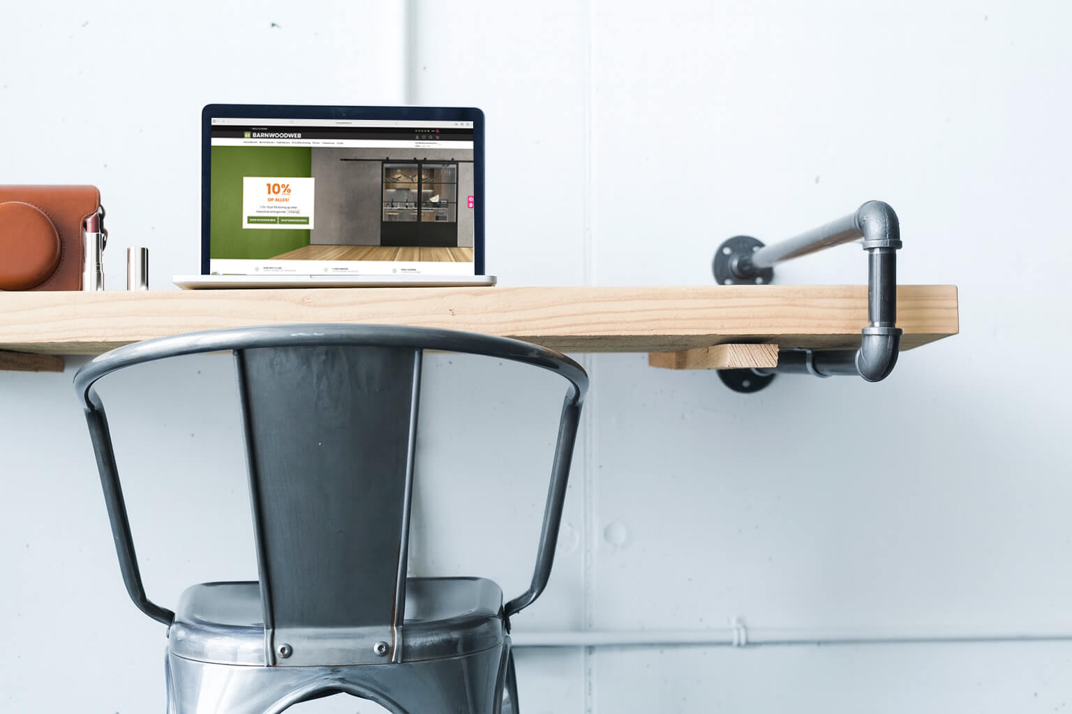 5. Wandbureau met houten plank en stalen steunen