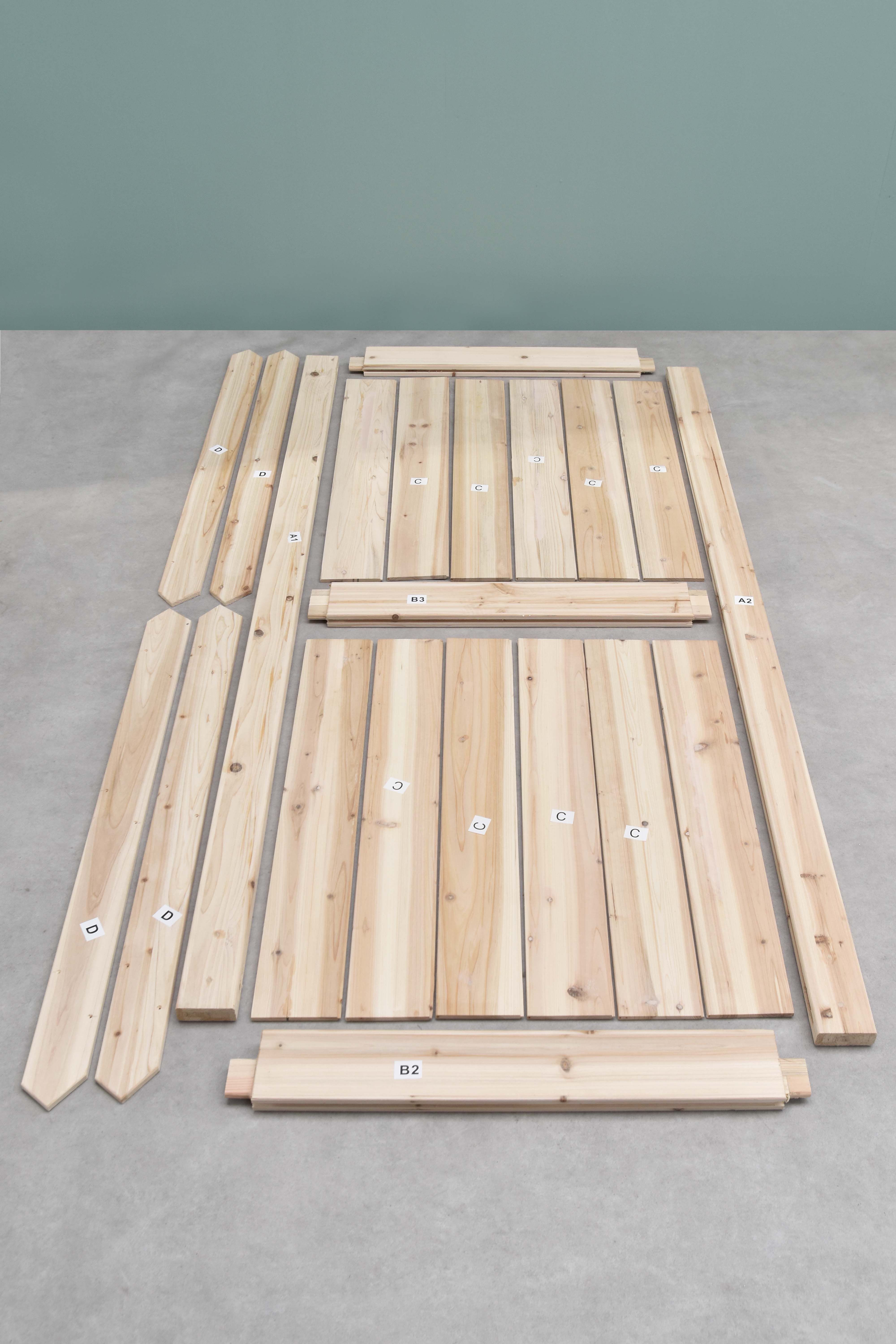 Begin met het sorteren van de houten planken op nummer en letter. Dit zorgt ervoor dat je tijdens het bouwen precies weet welke plank waar moet komen. Dit geeft je deur meteen al vorm en structuur. Wil jij je deur een kleurtje geven? Dan is dit hét moment om dat te doen. Tip: maak van tevoren een foto zoals onderstaand, zodat je de nummering nog kan zien.