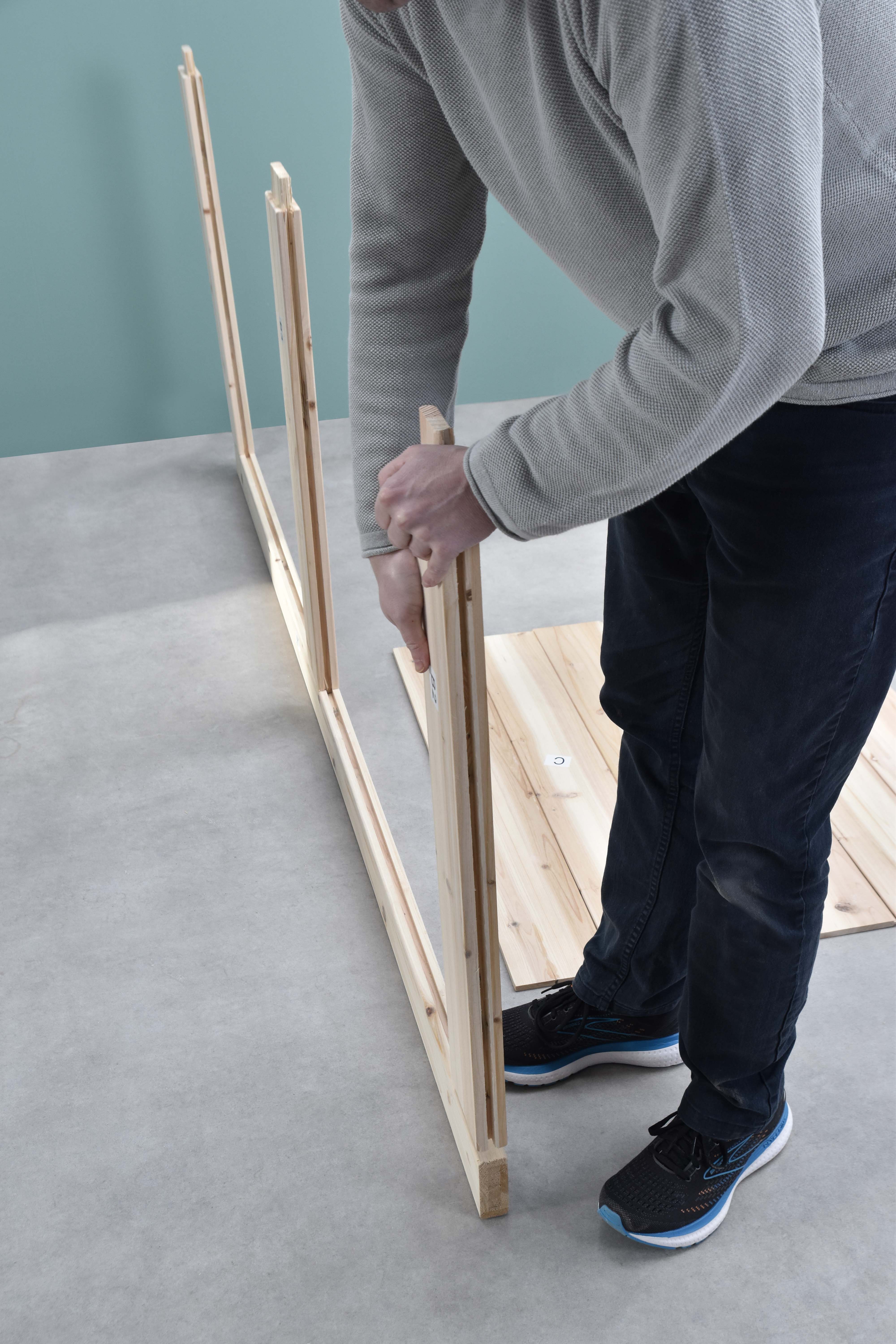 Maak de E-vorm: begin met het samenstellen van de planken voor de E-vormige basis. Gebruik schroeven om de planken stevig aan elkaar te bevestigen. Zorg ervoor dat alles waterpas en goed uitgelijnd is.
