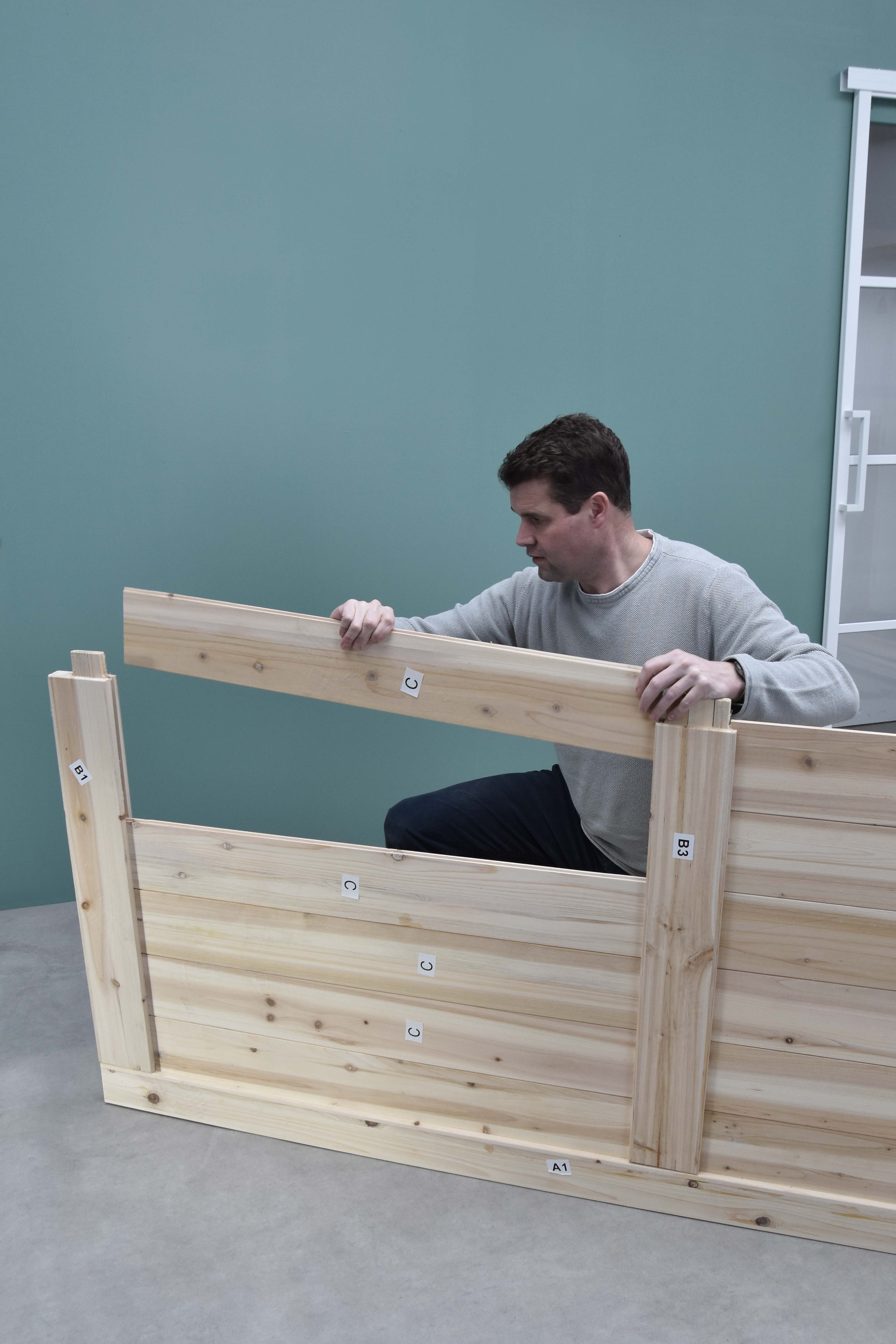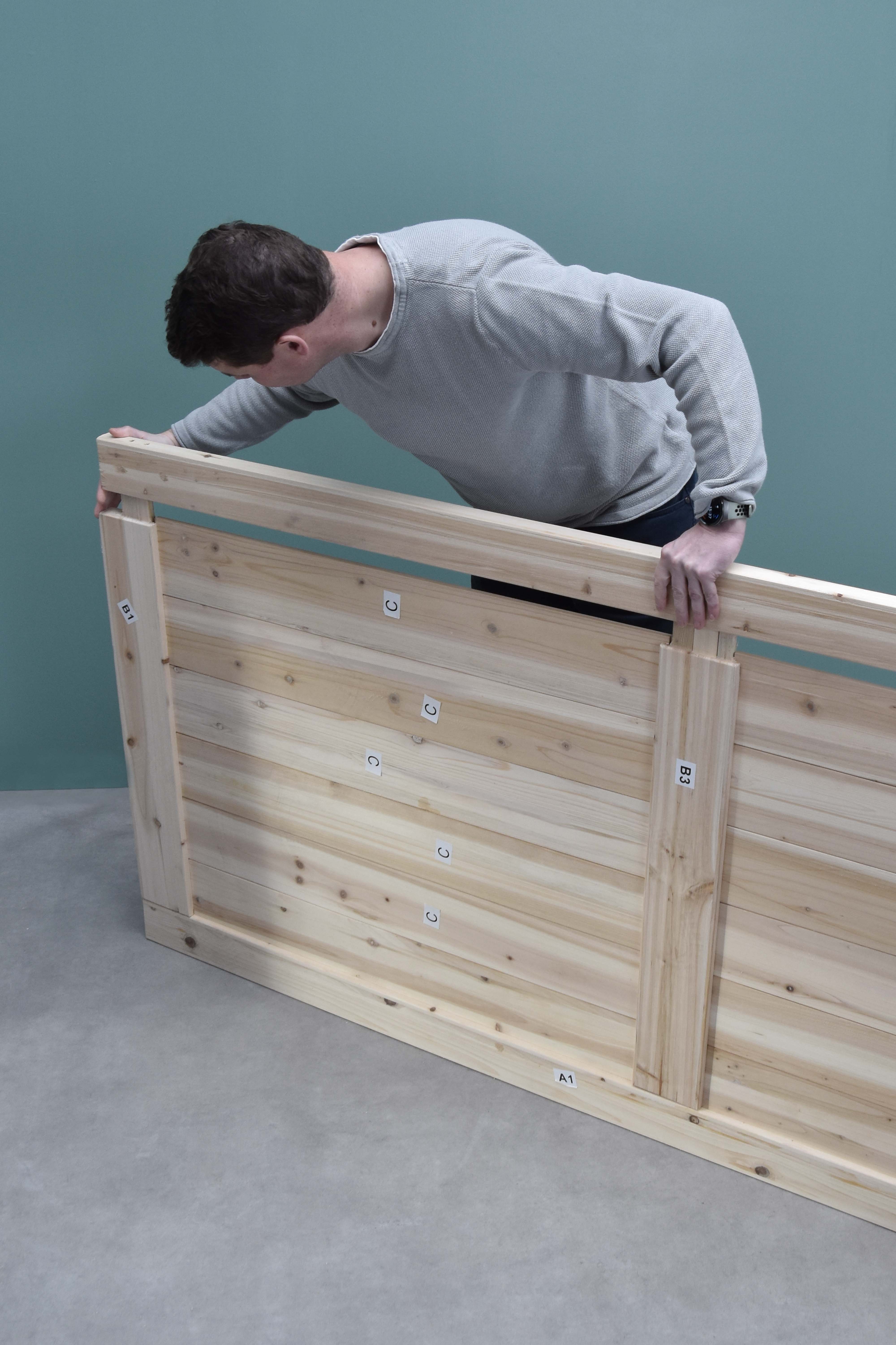 Tussenliggende planken: zodra de basisvorm staat, schuif je de tussenliggende planken in de constructie. Deze planken vormen het middenstuk van je deur en geven extra stevigheid.