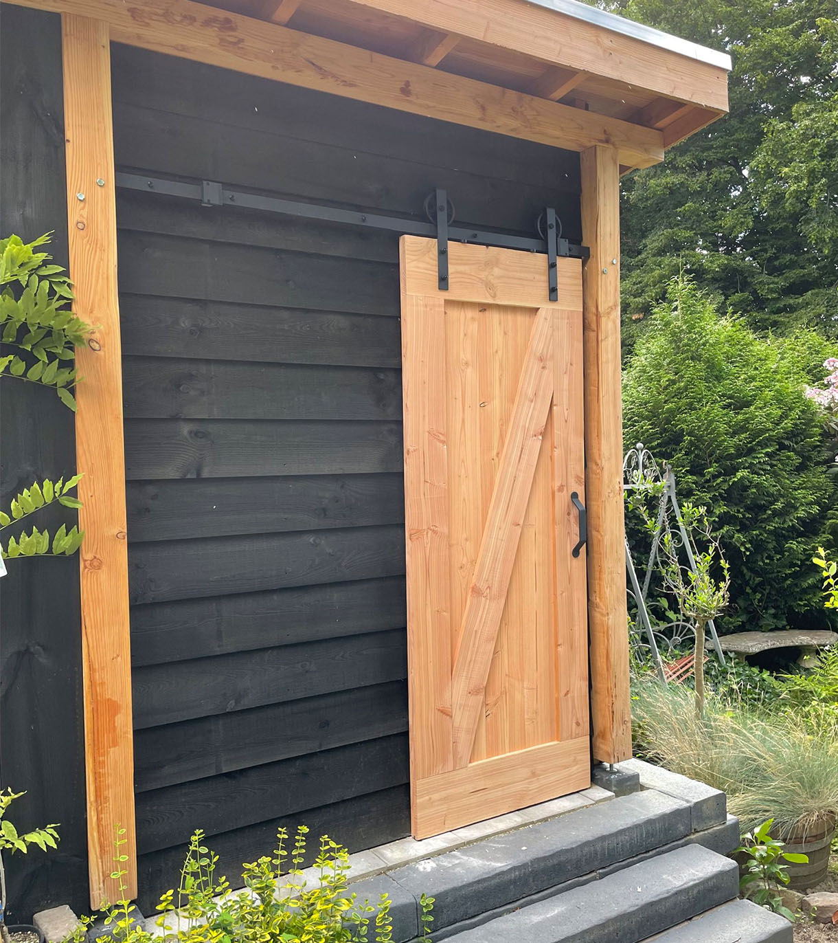 Een buiten schuifdeur voor je schuur is de ideale oplossing om je waardevolle spullen veilig op te bergen. Maar er zijn meer redenen om te kiezen voor een schuifdeur voor je schuur. Wat dacht je bijvoorbeeld van gemak? De schuifdeur is namelijk licht en gemakkelijk in gebruik. Ook bespaar je ruimte omdat de schuifdeur niet in de weg staat wanneer je hem opent. Ook is het handig als je bijvoorbeeld een trapje hebt buiten je schuif zoals op de foto. Bovendien ziet een houten schuifdeur er mooi uit en past perfect bij een landelijke of industriële inrichting van je tuin.