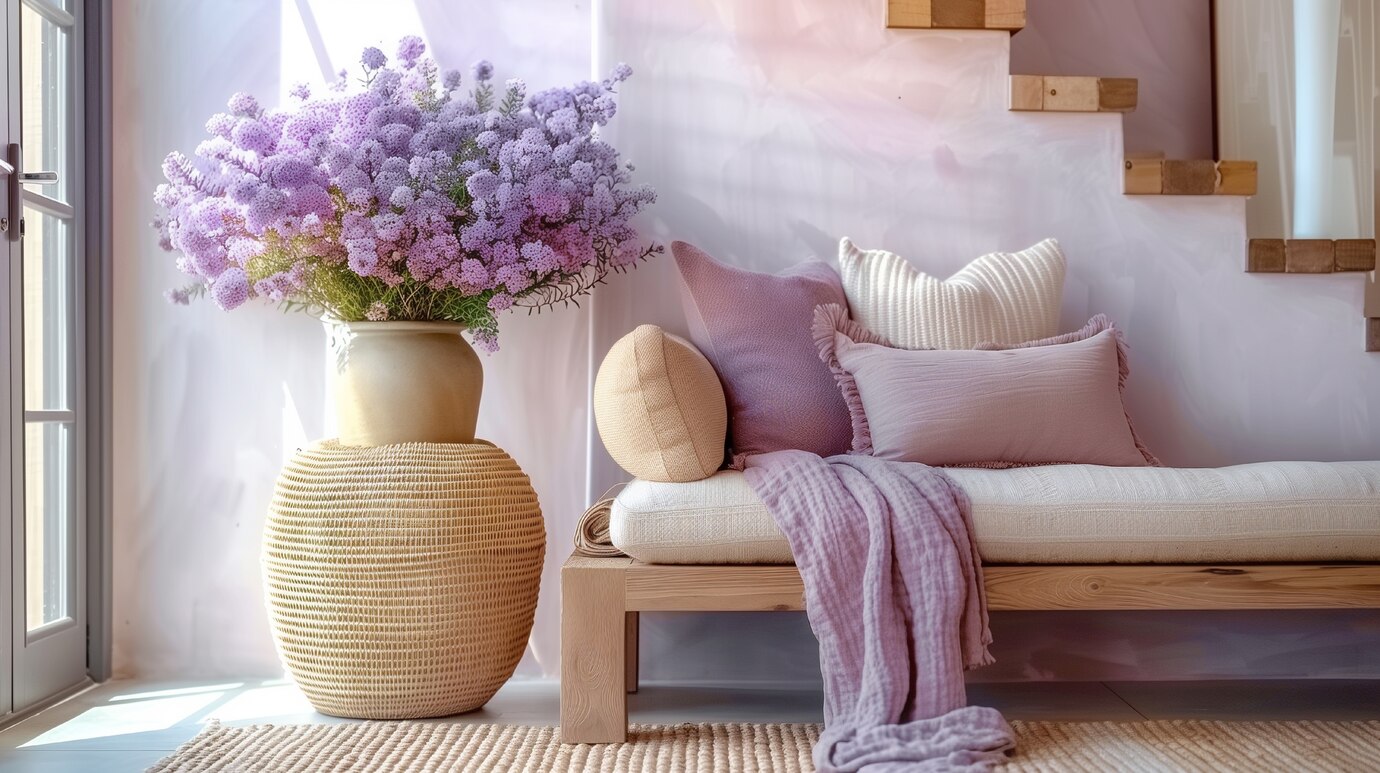 - Landelijk interieur: Warme lentetinten zoals zandkleur, perzik en crème zorgen voor een knusse, uitnodigende sfeer.