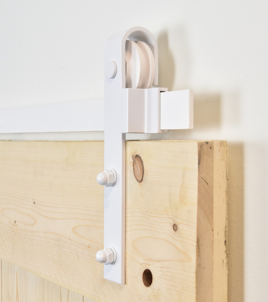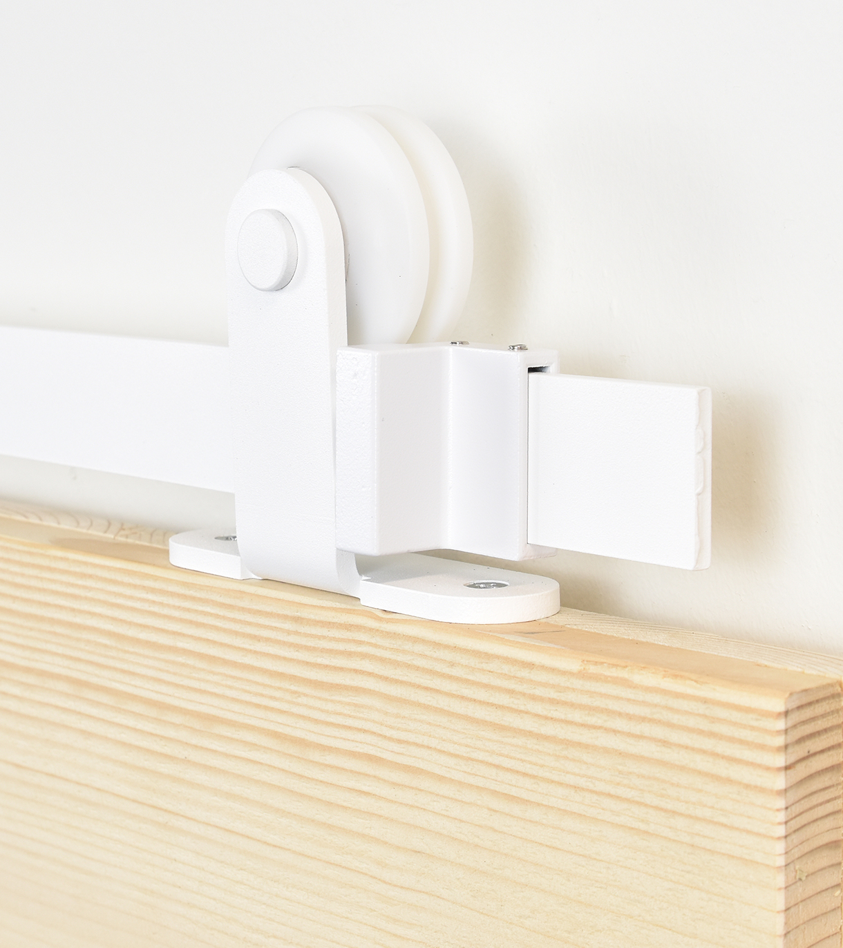 Het witte schuifdeursysteem is gemaakt van wit gepoedercoat staal. De kogellagers in de wielen zorgen voor een geluidsarme en soepele beweging over de rail. Het systeem is eenvoudig te monteren met de montagehandleiding.